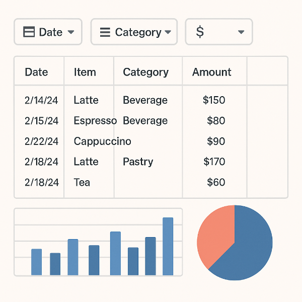 - 매출원천(Transactions): 일시, 메뉴, 수량, 단가, 채널, 결제수단, 할인, 세금구분, 비고