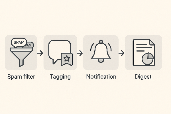 - 스팸 컷·우선순위 태깅 규칙(키워드·길이·링크 수)